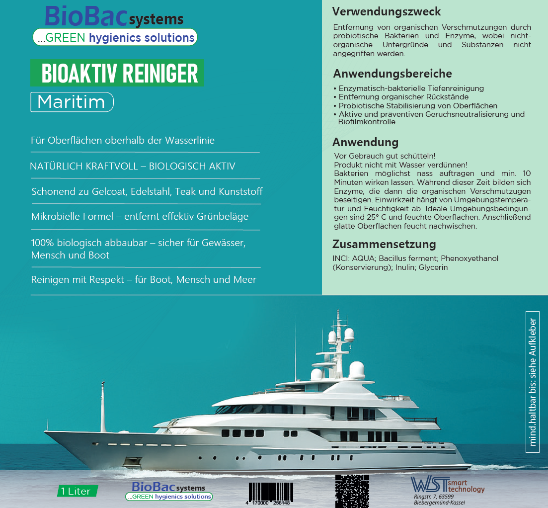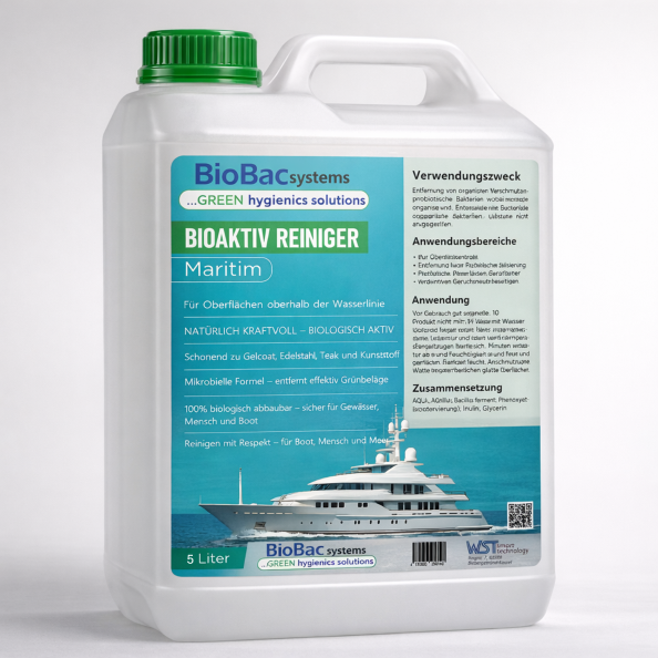 BaktoKratos Maritim nutzt hochstabile, probiotische Mikroorganismen, die organische Ablagerungen und Oberflächenfilme lösen – etwa auf Gelcoat, Teak, Edelstahl oder Lackflächen. Durch ihre enzymbildende Aktivität zersetzen die Mikroben organischen Schmutz bis in die Tiefe – ganz ohne aggressive Chemikalien, Tenside oder Duftstoffe. Ballaststoffe sichern die Aktivität der eingesetzten Mikroorganismen.
