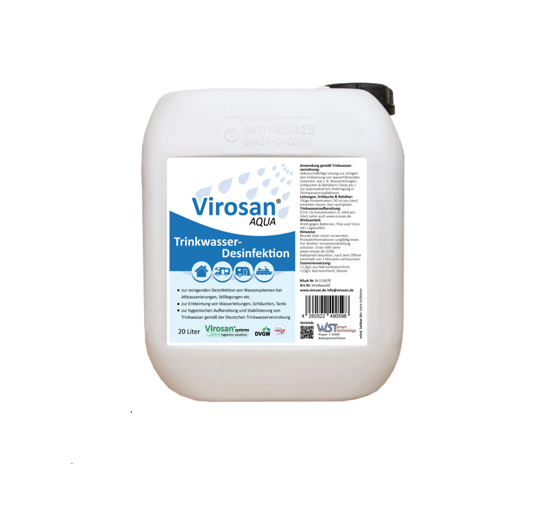 Virosan® AQUA entkeimt wasserführende Systeme von Bakterien, Pilzen und Viren inkl. Legionellen. Es ist rein mineralisch und nicht toxisch. Zur hygienischen Aufbereitung & Stabilisierung von Trinkwasser gemäß der Deutschen Trinkwasserverordnung (DVGW).